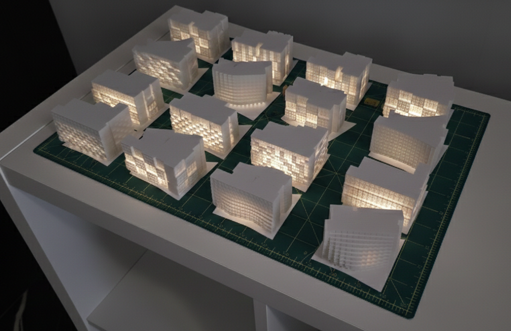 Out of all the design options explored, three or more are chosen and further developed. Plan layouts, materials, and other design elements are developed using visualization software, and subsequently physical mock-ups are made. As already mentioned, physical models in different scales play an important part in our design process. They are used to make sure nothing is missed, as they are the closest thing to the final product of a real-size building.
